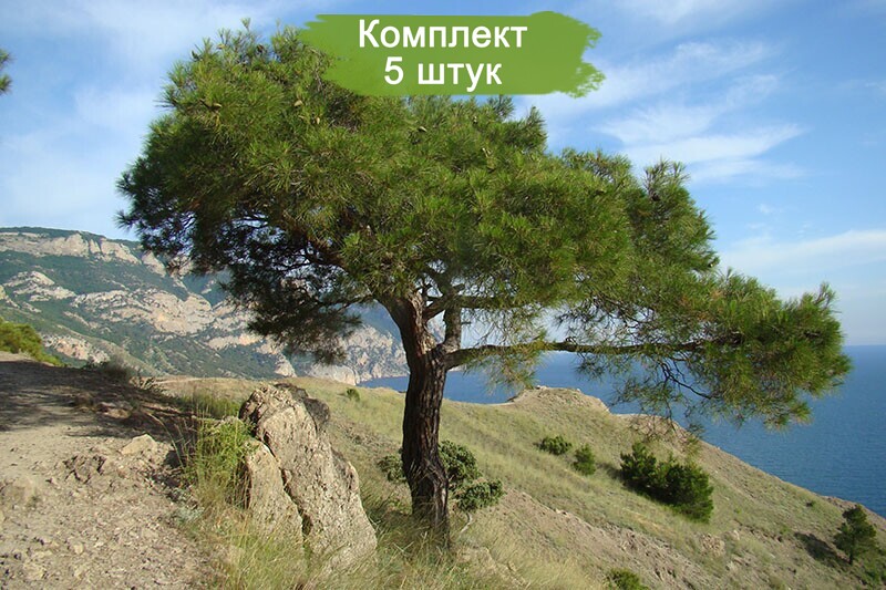 Комплект из пяти саженцев Крымской сосны, размером от 100 до 150 см, предлагается по привлекательной цене: пять саженцев по стоимости четырех. Крымская сосна - это дерево, достигающее в зрелом возрасте 30-50 метров в высоту, исторически использовавшееся в корабельной промышленности благодаря прочности и качеству своего древесного материала.